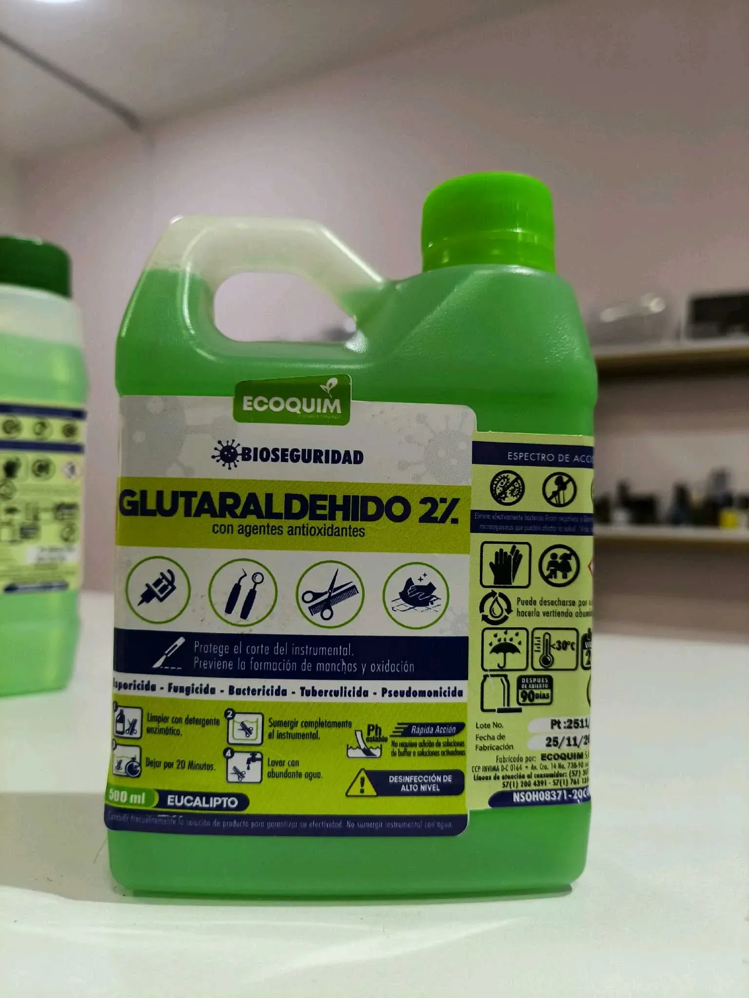 Glutaraldehido al 2% y agentes antioxidantes. Es una solución de color verde translucido y olor a menta, el cual enmascara el olor característico del Glutaraldehido.